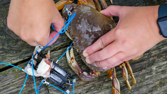 The crab snare is attached to the end of your main line to the leader line of your crab snare. You open up the lid of the crab snare, put your preferred bait in the middle and close the lid. You cast out into the body of water and wait about 5 minutes. When a crab finds the snare, it's legs are entangled or within one of the loops. When you reel up, the loops cinch down on the crabs legs acting like a sliding noose. By keeping constant tension from your reeling, the loops stay engaged on the crab's legs, snaring them up.